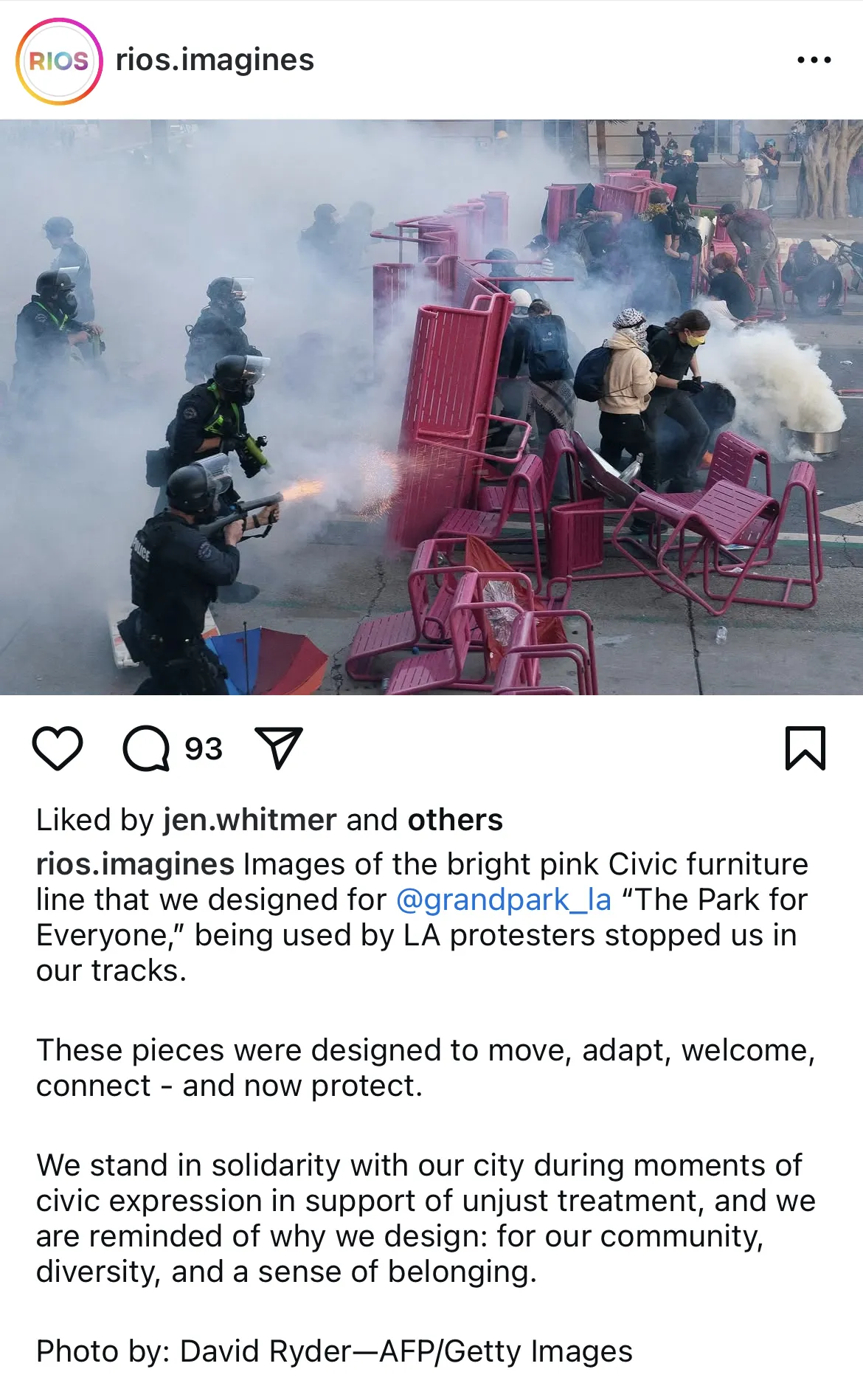 Among the many incredible images that emerged out of the recent LA uprising against ICE deportations was a widely circulated photograph of protesters using bright pink urban furniture as street barricades against riot police. The company that designed the chairs and benches, architecture and design firm RIOS, soon posted the photo on their official Instagram account with a caption declaring their solidarity with their “city during moments of civic expression”. When my friend C, who was plugged into many on the ground actions, shared the post with me, I was incredulous and also quite thrilled. This was one of the first times, if not the very first time, I’d seen a design firm so brazenly and actively encouraging what was in my mind clearly a direct action riot tactic. Despite their use of language like “civic expression” and “diversity and belonging”, here was a design firm calling us “to the barricades again…” It was surreal.